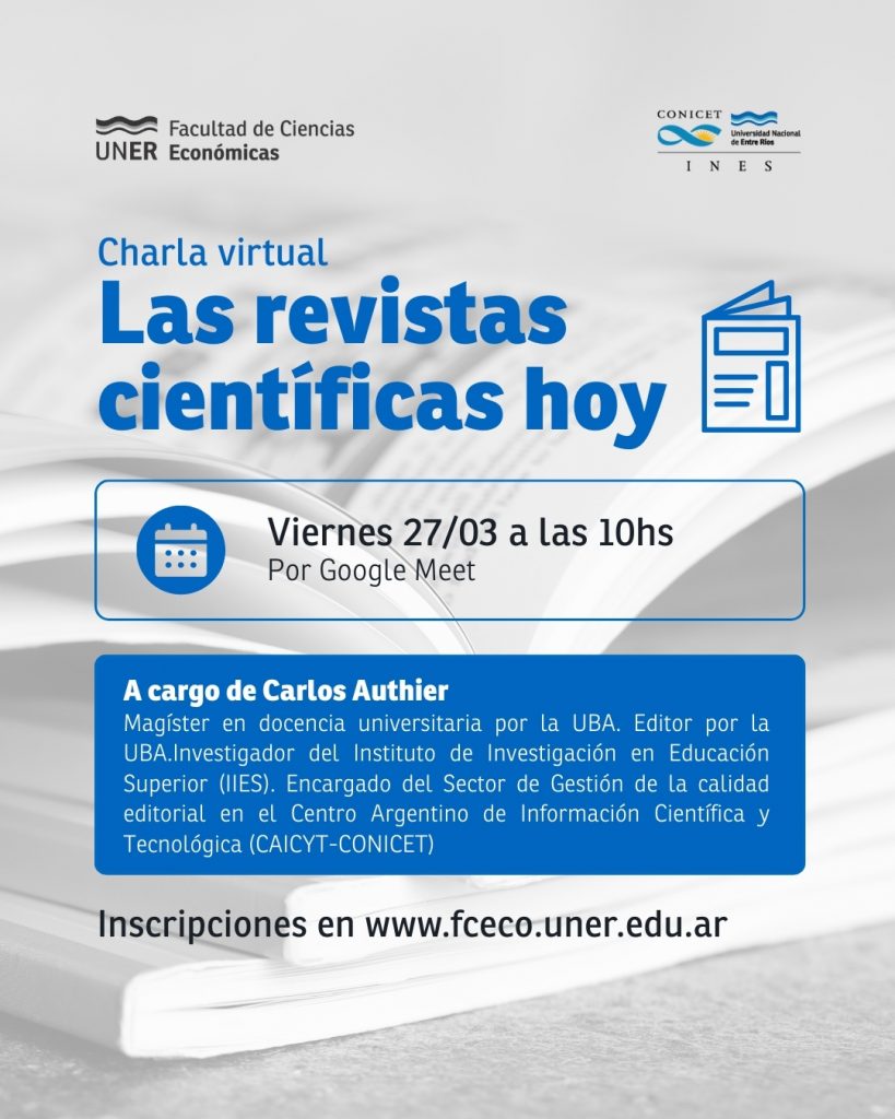 El Instituto de Estudios Sociales (INES) CONICET - UNER junto a la Facultad de Ciencias Económicas (FCECO) UNER organizan e invitan a la charla titulada "Las revistas científicas hoy", que se realizará el día viernes 27 de marzo a las 10:00 horas en modalidad virtual.