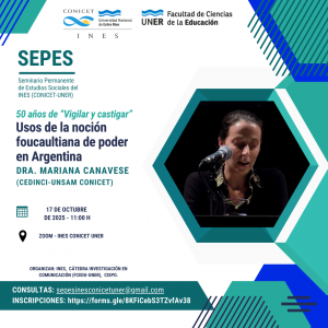 Invitamos a participar de la conferencia “50 años de Vigilar y castigar. Usos de la noción foucaultiana de poder en Argentina” que estará a cargo de la Dra. Mariana Canavese (CeDInCI-UNSAM CONICET)